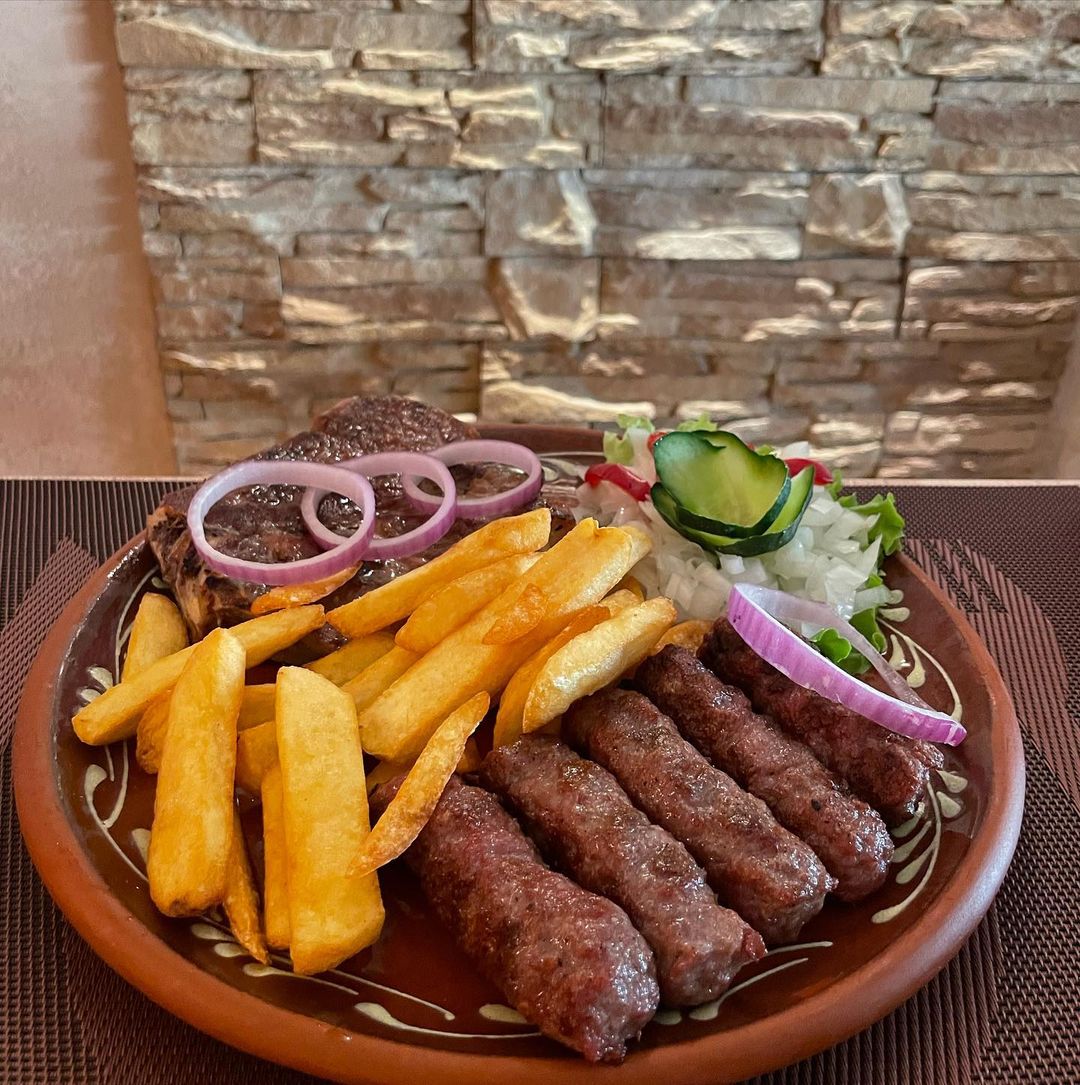 Sočni i ukusni ćevapi. 10 komada sa pola somuna i lukom. Plus krompir, koji zovu pomfrit. Preporuka.